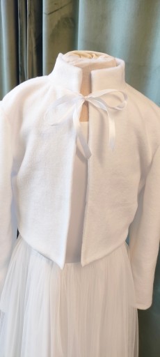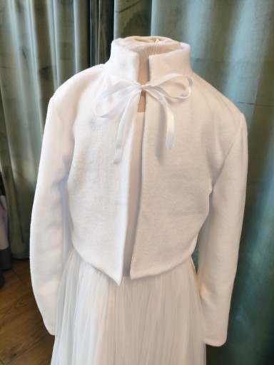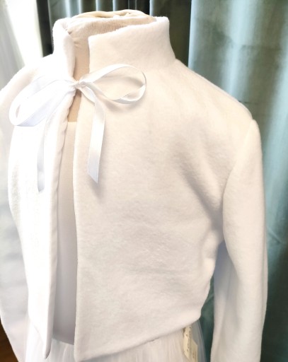 Ciepłe bolerko uszyte z miękkiego polaru to idealnie skrojone nakrycie wierzchnie, które ukazuję przód sukienki. Stójka przy szyi to najnowszy trend komunijnych stylizacji wiązana tasiemką na kokardkę.