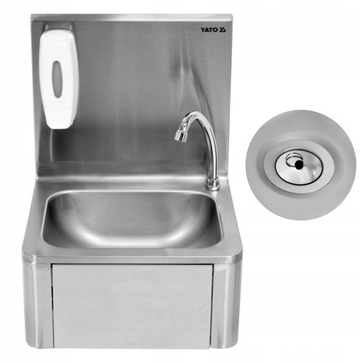 Umywalka kolanowa YATO wykonana jest z wysokiej jakości stali nierdzewnej. W zestawie jest także wylewka sztorcowa, dozownik na mydło oraz komplet zaworów i wężyków koniecznych do zainstalowania umywalki i podłączenia jej do sieci wodociągowej. Poza zaworem czasowym uruchamianym kolanem, w zestawie jest także mikser z regulacją, który umożliwia ustawienie temperatury wody.