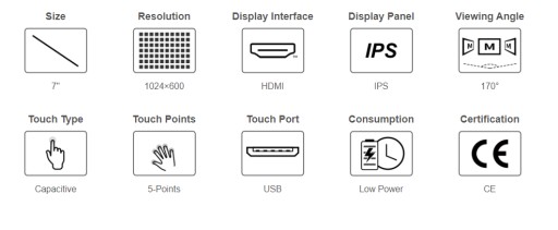 7-calowy wyświetlacz HDMI o rozdzielczości 1024×600 z pojemnościowym panelem dotykowym, który obsługuje Raspberry Pi i może służyć również jako monitor komputerowy.
