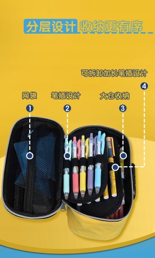 Piórnik składa się z 1 dużej komory, 2 paneli na długopisy, ołówki, flamastry itp oraz 1 przegródki siateczkowej.