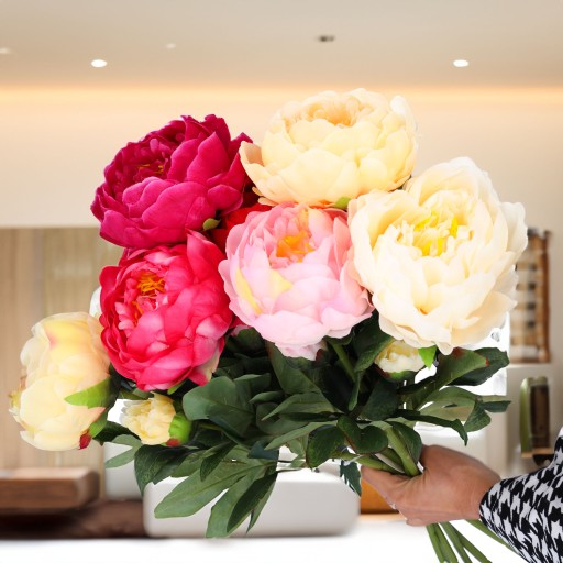Precyzyjnie wykonane kwiaty piwonii charakteryzują się naturalnym wyglądem, który trudno odróżnić od prawdziwych kwiatów, zachwycając swoją fakturą i odcieniami.