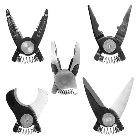 Wielofunkcyjne szczypce dla elektryków. Dzięki wymiennym głowicom szczypce można zamienić w 5 różnych narzędzi.