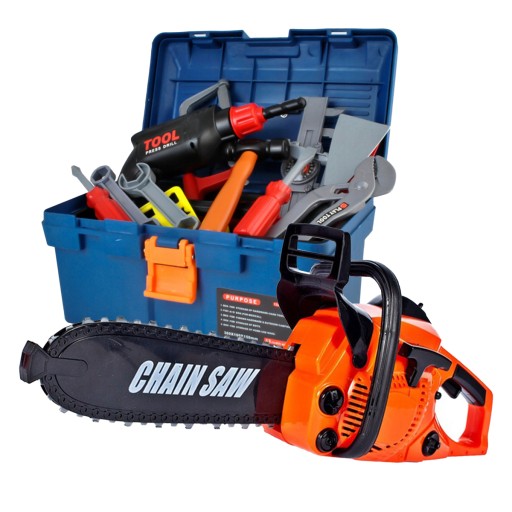 SKRZYNIA Z NARZĘDZIAMI DLA DZIECI + PIŁA MOTOROWA Z AKCESORIAMI