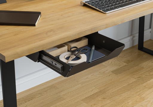 Szuflada została specjalnie zaprojektowana z myślą o przechowywaniu dokumentów, przedmiotów biurowych oraz telefonu, umożliwiając łatwy dostęp do niezbędnych rzeczy w trakcie pracy. Jej kompaktowe wymiary pozwalają na zamontowanie jej pod blatem biurka, co sprawia, że jest dyskretnym rozwiązaniem, jednocześnie optymalnie wykorzystującym dostępną przestrzeń.