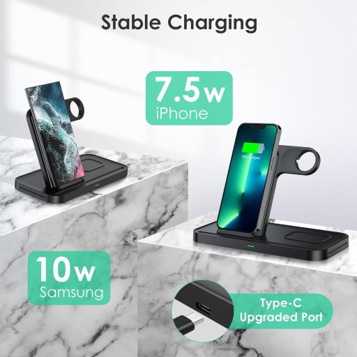 【Bezprzewodowa stacja ładująca 3 w 1】 Bezprzewodowa ładowarka LK 4 w 1 z QC 3.0 umożliwia jednoczesne ładowanie 3 urządzeń. Szybkie ładowanie 7,5 W kompatybilne z iPhonem 15/14/13/13 Pro/Pro Max/12/11 Pro/Pro Max/SE 2/XR/XS/X/8/8Plus; Szybkie bezprzewodowe ładowanie 10 W do Samsunga Galaxy S22/S21/S20/S20+/S10/S10+/S9/S9+/S8; 3 W dla iWatch 8/7/6/5/4/3/2; 5 W dla AirPods Pro/3/2, Galaxy Buds/Buds+. (Uwaga: NIE ZAWIERA kabla ładującego iWatch.)