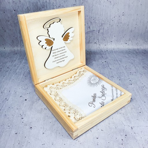 drewniane naturalne pudełko wraz z szatką jest delikatne i estetyczne. Zostało subtelnie naniesioną grafiką wraz z imieniem dziecka oraz datą chrztu.