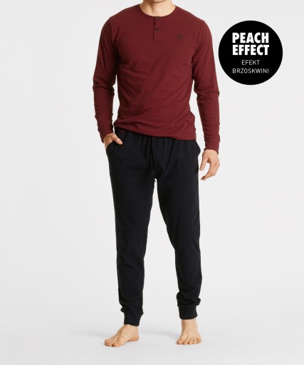 Piżama męska, to zestaw: koszulka z długim rękawem w kolorze czerwonego wina oraz długie, granatowe spodnie. Luźne i niezwykle wygodne spodnie mają proste nogawki i ściągacze u dołu. Mają też praktyczne kieszenie po bokach oraz są wiązanie w pasie. Koszulka ma okrągły dekolt, zapinany na dwa guziki, po prawej dyskretne logo Atlantic w kolorze produktu.
