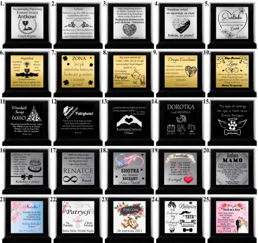 ➡️ Przy zakupie z opcją "Zapakuj na prezent" pudełko z dedykacją posiadać może następujące tabliczki - dostępne są blaszki w następujących kolorach (w razie braku wyboru wysyłane losowo).