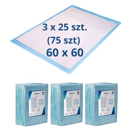 Na tej aukcji dokonujesz zakupu 3 opakowań podkładu jednorazowego o wymiarze: 60x60 cm (1 opakowanie zawiera 25 szt.)