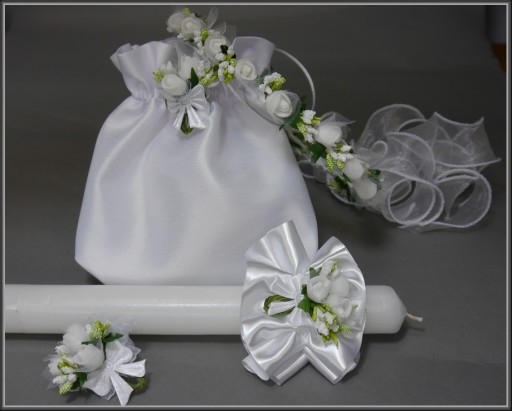 Torebka komunijna w kształcie woreczka z prostym dołem. Wykonana z satyny atłasowej odszytej na matową stronę. Na życzenie możemy odszyć torebkę na błyszczącą stronę. Do torebki można dopasować dostępne na naszych pozostałych aukcjach, następujące artykuły komunijne: okapnik na świecę wianek czy bransoletkę. Produkt Polski !!!