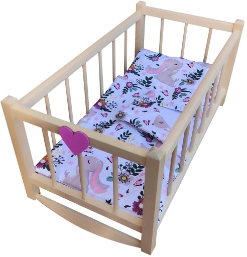 Kołyska wykonana jest solidnie i starannie z drewna bukowego, wyszlifowane, kanty zaokrąglone, ozdobione różowym serduszkiem, drewniana konstrukcja nie lakierowana.