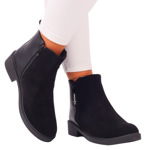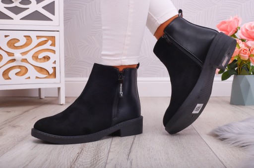 Damskie, wsuwane botki na obcasie w kolorze czarnym. Posiadają zapięcie na dwa suwaki, co umożliwia łatwe zakładanie. Stabilna, gruba podeszwa dobrze amortyzuje stopę oraz chroni przed zimnem. Wykonane z dobrych jakościowo materiałów. Prosty fason sprawia, że pasują do wielu stylizacji.