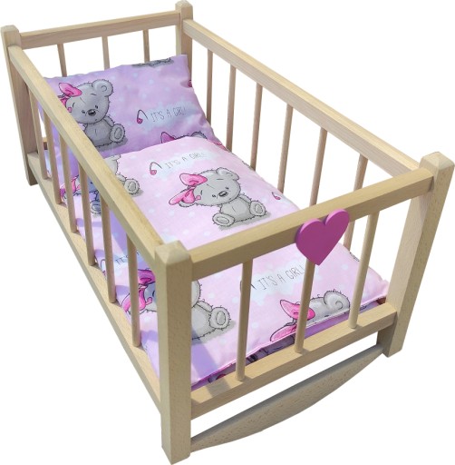Kołyska wykonana jest solidnie i starannie z drewna bukowego, wyszlifowane, kanty zaokrąglone, ozdobione różowym serduszkiem, drewniana konstrukcja nie lakierowana.