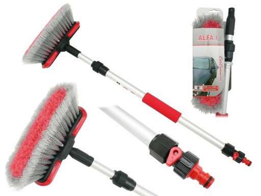 Szczotka posiada wygodną aluminiową rączkę - wraz z teleskopowym kijem. Szczotka na wysięgniku teleskopowym, może sięgnąć maksymalnie do 100 cm. Odtąd mycie samochodu, stanie się dla nas przyjemnością. Szczotka bardzo przydatna przy pojazdach, czy też w samych domach, w ciężko dostępnych i wysokich miejscach. W zestawie złącze podłączeniowe do węża ogrodowego.