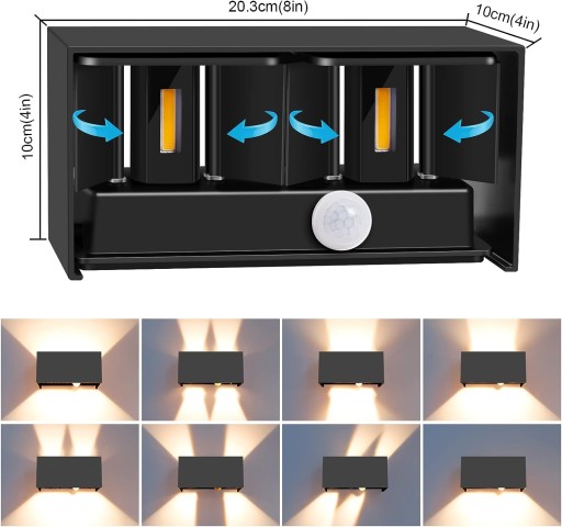 🌟 【Regulowany kąt świecenia】: Lampa zewnętrzna z czujnikiem ruchu ma prostą i piękną konstrukcję, z wbudowanymi przegrodami na górze i na dole. Regulując przegrodę, można regulować różne kąty świecenia w tej samej scenie. Funkcja regulowanego kąta rozsyłu światła wewnętrznego kinkietu zapewnia przyjemniejsze wrażenia Tobie i Twojej rodzinie.