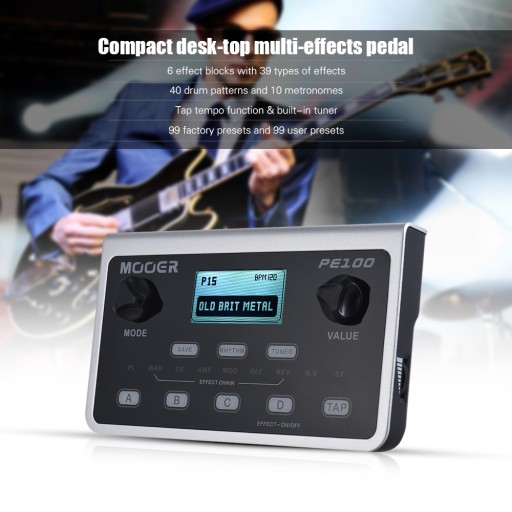 PE100 to kieszonkowe urządzenie typu desktop-top, które zawiera wszystko, czego gitarzysta potrzebuje ciasno owinięte w małą gładką muszelkę. Pełna gama modeli wzmacniaczy, mnóstwo efektów i efektów gitarowych, precyzyjny tuner, wzory perkusyjne i metronom. Podwójne gniazda wyjściowe sprawiają, że idealnie nadaje się do podłączenia do wzmacniacza, hifi, słuchawek lub bezpośrednio do miksera lub komputera do bezpośredniego nagrywania. Super łatwy do zaprogramowania, wystarczająco mały, aby wsunąć go do kieszeni i zasilany małym zasilaczem prądu stałego lub baterią. PE100 jest idealny dla gitarzysty w podróży.