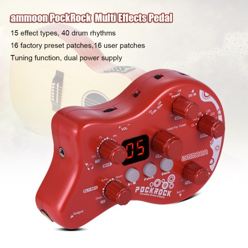 ammoon PockRock jest przenośnym Guitar Multi-pedał efektów. 5 modułów efektów z 15 typów efektów, 40 rytmów perkusyjnych, 16 gotowych plastrów i 16 plastrów użytkownika. Jest to nie tylko biblioteka dźwiękowa, ale również pozwala tworzyć własne biblioteki dźwięków. Z wyjście słuchawkowe i wyjście AUX, można cieszyć się grając w nocy i nie trzeba się martwić o przeszkadzając innym. Tryb Zasilanie bateryjne pozwala zabrać go wszędzie. Wszystko, co potrzebne jest w PockRock!
