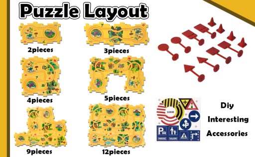 Ten zestaw zabawek dla dzieci zawiera 12 puzzli, 12 znaków drogowych, 1 Zielony pojazd terenowy(wymagana 1 bateria AAA, brak w zestawie). Małe dzieci muszą złożyć puzzle na określonej ścieżce, aby uruchomić Samochodzik na torze.