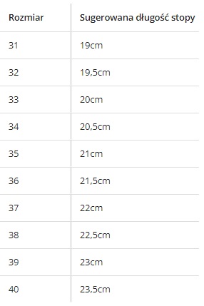 Przy wyborze rozmiaru proszę kierować się PODANĄ DŁUGOŚCIĄ STOPY, rozmiarówka buta jest zaniżona.