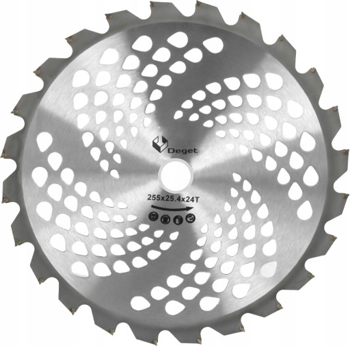 Specjalna tarcza tnąca z widią marki Deget, o wymiarach 255x25.4 mm z 24 zębami tnącymi - do zastosowania z kosami oraz podkaszarkami spalinowymi.