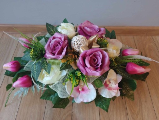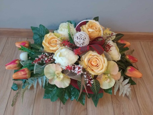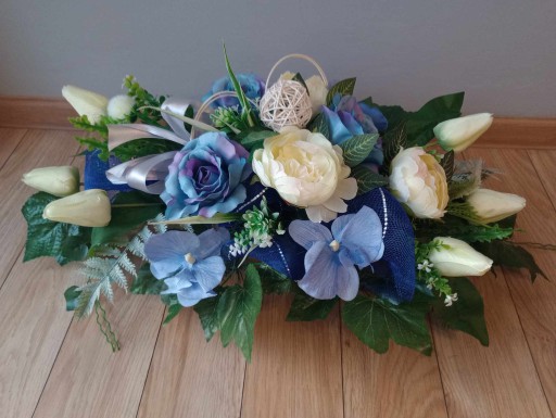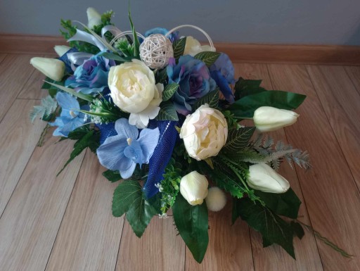- Kompozycja sztuczna (tzw. stroik, ikebana) do postawienia na płycie grobu jest wykonana w doniczce plastikowej, ma ok. 60 cm długości i 45 cm szerokości.