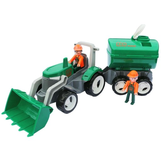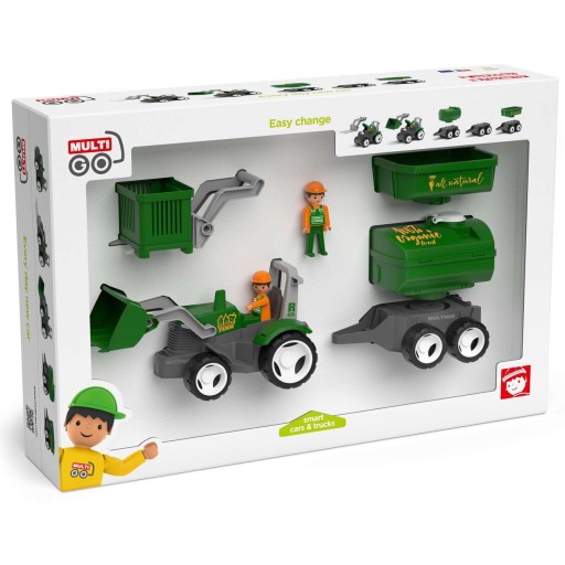 Zestaw MultiGO doskonale nadaje się do zabawy w rolników. Dzięki 2 figurkom rolników dołączonym do opakowania, będą stanowić doskonały zespół, z którym można odgrywać wiele ciekawych scenek. Na ten fantastyczny duży zestaw składa się również ciągnik z wymiennymi nadwoziami - łyżka, cysterna, widły załadowcze i skrzynia ładunkowa.