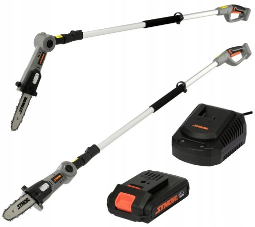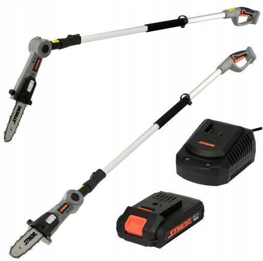 Teleskopowa okrzesywarka akumulatorowa do obcinania konarów. Dzięki teleskopowemu trzonkowi urządzenie może być rozłożone na długość 274 cm. Dla wygody użytkownika przy obcinaniu gałęzi można regulować pochylenie głowicy pilarki. Pilarka wyposażona jest w automatyczne smarowanie łańcucha. Antypoślizgowa rękojeść umożliwia pewny chwyt podczas pracy. Okrzesywarka jest zasilana akumulatorem pasującym do serii urządzeń systemu 20 V Sthor.