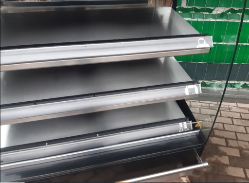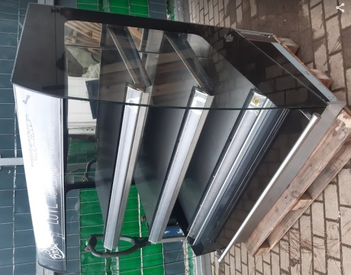 Witryna grzewcza z oświetleniem półek i wymuszonym obiegiem powietrza. Wymiar zewnętrzny 120 x 80cm głębokość z odbojem x 132cm wysokość. Wymiar roboczy półek 113 x 46cm.
