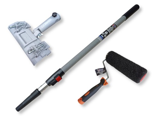 W zestawie znajduje się kij teleskopowy z włókna szklanego, z regulowaną długością od 80 do 140 cm, na który można w prosty sposób zamontować adapter ze szpachlą lub wałek. Końcówka kija zakończona metalowym gwintem, posiada również adapter, który umożliwia mocowanie na klin.