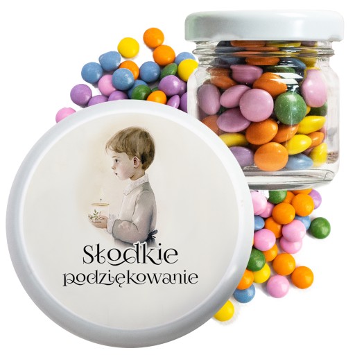 Ozdobne słoiczki 40ml wypełnione pysznymi lentylkami wraz z naklejką "Słodkie Podziękowanie" jako podziękowanie dla Waszych gości.