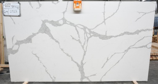 Przedmiotem aukcji jest docięty do rozmiaru o długości 100cm, szerokości 60cm i grubości 3cm blat kuchenny z białego spieku, konglomeratu kwarcytowego CALACATTA WHITNEY / TURBO.