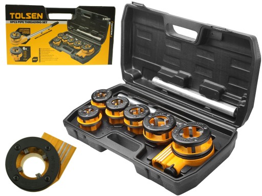 Gwintownica ręczna do rur + zestaw narzynek w walizce, umożliwia tworzenie trwałych połączeń gwintowanych. Sprawdza się podczas prac hydraulicznych jak i w warsztatach stolarskich.