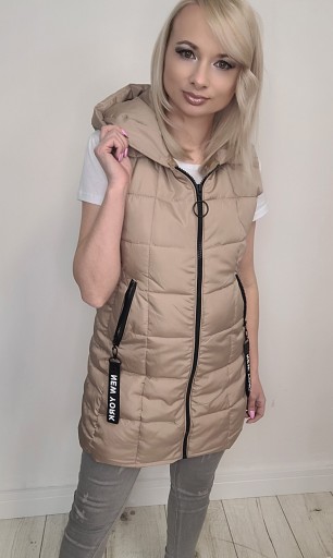 Kamizelka bezrękawnik damski pikowany z kapturem. Kamizelka i kieszenie zapinane na zamek błyskawiczny. Obszerny kaptur ochroni przed wiatrem.