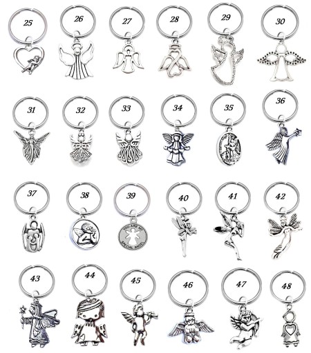 Wielkość aniołków ok. 20-25mm, wielkość kółeczka breloka 25mm, papier ozdobny o gramaturze 260g, wymiary karteczki ok. 6x9cm