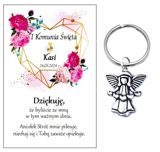 PAMIĄTKA UPOMINEK PREZENT PODARUNEK DLA GOŚCI Z OKAZJI KOMUNII ŚWIĘTEJ - KARTECZKA Z PODZIĘKOWANIEM I BRELOCZKIEM W KSZTAŁCIE ANIOŁKA.