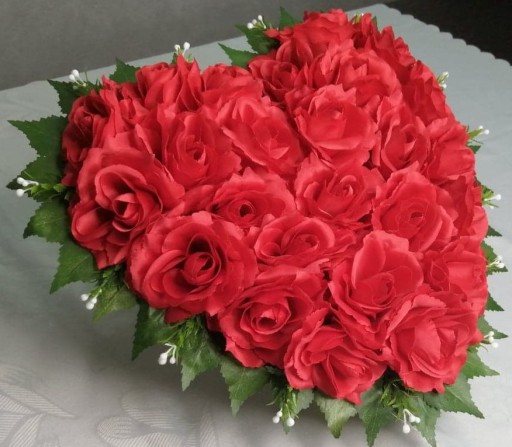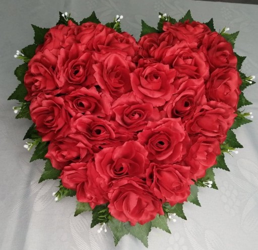 Serce ozdobione recznie z wysokiej jakosci sztucznych kwiatow, umocowane w donicy zalanej betonem.