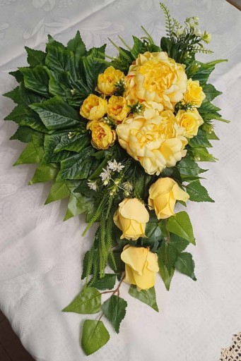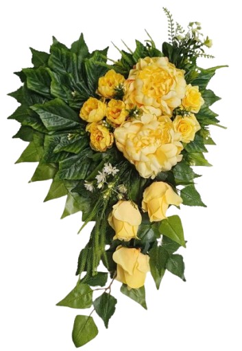 Serce ozdobione recznie z wysokiej jakosci sztucznych kwiatow, umocowane w donicy zalanej betonem.