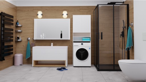 ✨Półka na pralkę posiada jedną szafkę oraz otwartą przestrzeń, co dodatkowo zwiększa jej funkcjonalność i możliwość przechowywania.