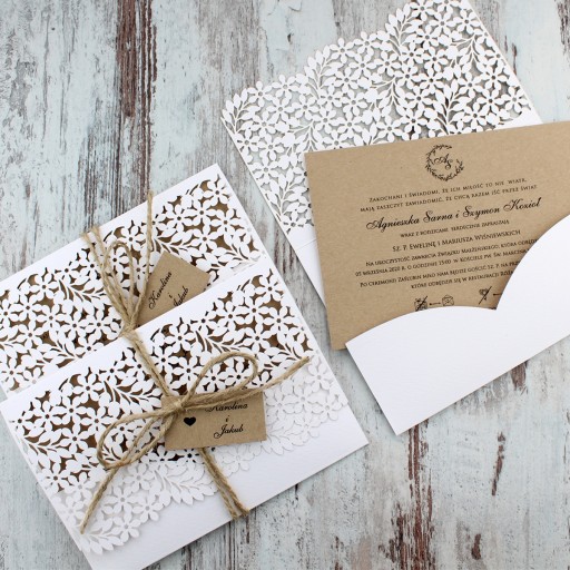 - Cena zawiera: ażurową kopertę, ekologiczną wkładkę, sznureczek jutowy z zawieszką z imionami Pary Młodej
