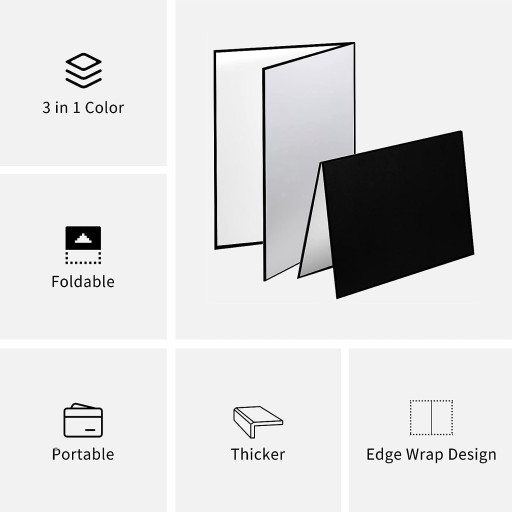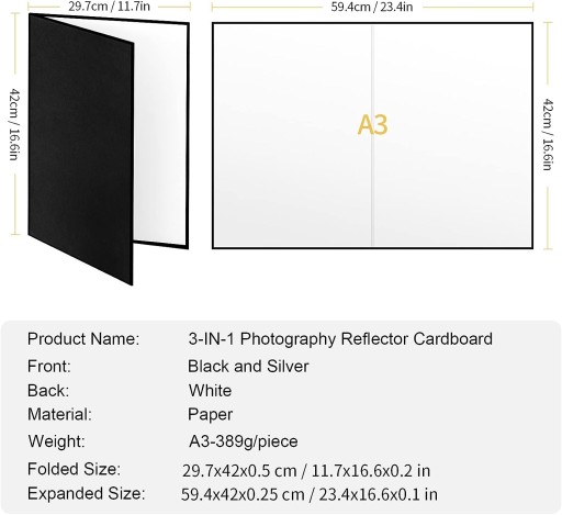3 kolory w jednym reflektorze biaa czarna i srebrna powierzchnia moe by uywana zarówno z przodu jak i z tyu. Nadaje si doskonale do wypeniania odbijania wiata rozpraszania blokowania lub zmikczania wiata w szczególnoci do redukcji cienia lub podkrelania konturów. Pasuje do rónych wymagań fotografii odblaskowej. Zastosowanie moe by uywany jako reflektor lub jako to tymczasowe. Idealnie nadaje si do fotografii produktów szklanych lub ceramicznych do fotografii biuterii fotografii kosmetycznej fotografii produktów spoywczych do studia fotograficznego. Kompaktowy format standardowa deska A3 o wymiarach 297 x 42 cm ma wymiary do 594 x 84 cm. Jest nieco wikszy ni zwyky arkusz papieru uywany jako rekwizyt do fotografii na biurko do maych przedmiotów i nie zajmuje duo miejsca. Jako premium pyta reflektora fotograficznego o gruboci 025 cm lekka i przenona ni tradycyjne reflektory. Równie gruby jak papier fotograficzny. Skadana konstrukcja moe sta swobodnie bez uchwytu mona atwo wykonywa zdjcia za pomoc reflektora.