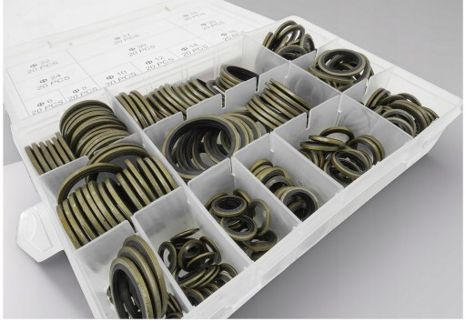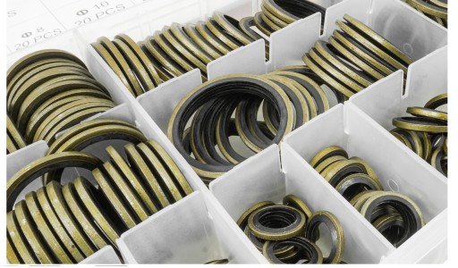 Zestaw metalowo-gumowych podkładek uszczelniających w rozmiarach od M6 do M30. Wykonane z metalu i gumy posiadają dobre właściwości uszczelniające, są odporne na wysokie ciśnienie i olej.