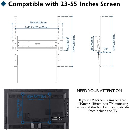 - ✅Uniwersalny design. Ten uchwyt ścienny do telewizorów pasuje do większości telewizorów LCD / LED / plazmowych / OLED / płaskich między 23-55 cali, idealne dla Samsung, Element, LG, Sony, Panasonic, TCL i innych. Kompatybilny rozmiar VESA: 100x100mm, 200x100mm, 200x200mm, 300x300mm, 400x200mm, 400x300mm, 400x400mm.
