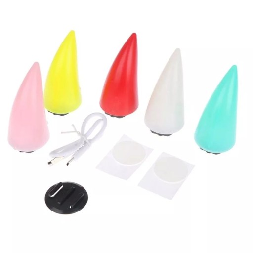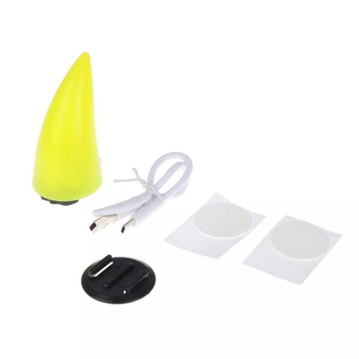 Plastikowe ozdobne rogi do kasku z podświetleniem LED. Mocowane do kasku za pomocą taśmy obustronnie przylepnej (w zestawie). Są wykonane z tworzywa sztucznego i mają kształt rogów. Główna funkcja to ozdoba kasku i świecenie światłem ciągłym. Każdy róg jest wyposażony we włącznik i gniazdo USB C do ładowania wbudowanego akumulatora.