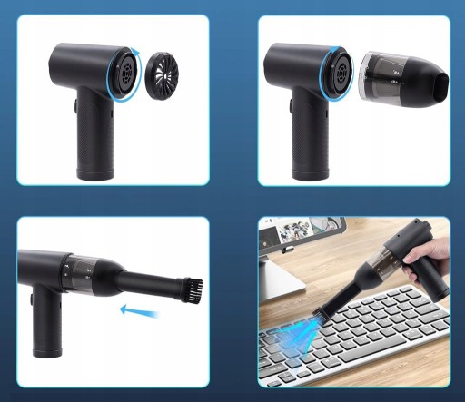 - ✔️ Elektryczny odkurzacz z dmuchawą 2 w 1 jest wyposażony w akumulator o pojemności 6000 mAh, który można ładować za pomocą kabla USB, a czas pracy wynosi około 20-30 minut.