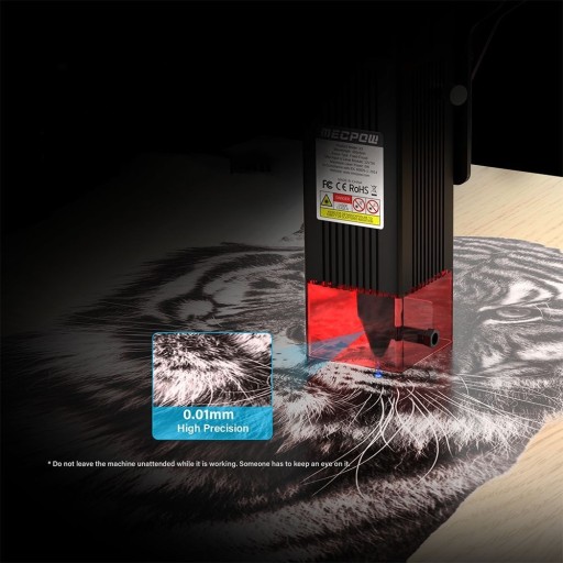 - Mecpow X3 wykorzystuje laser diodowy o mocy 5W z małym ogniskiem 0,05x0,07mm i dokładnością grawerowania 0,01mm. Mały rozmiar plamki i krótkie impulsy zapewniają wysoką moc szczytową, umożliwiając bardziej precyzyjne, głębsze grawerowanie i cięcie. Może ciąć deski drewniane o grubości 8 mm i płyty akrylowe o grubości 8 mm.