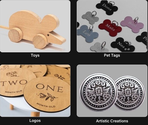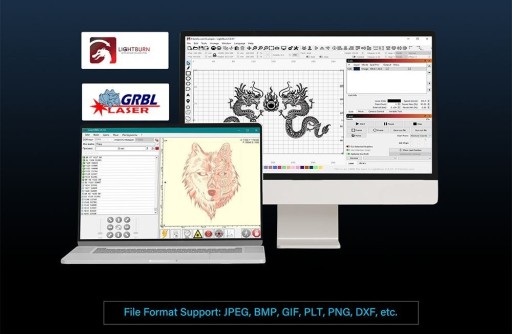 - Grawerka X3 może być używana do grawerowania różnych materiałów, w tym drewna, akrylu, skóry, bambusa, tkaniny, stali nierdzewnej itp. Jest kompatybilny z LaserGRBL (tylko Windows) i LightBurn (Windows i Mac OS) i obsługuje różne formaty plików, w tym JPG, PNG, DXF, TIF, PDF, SVG, AI, NC, BMP itp.