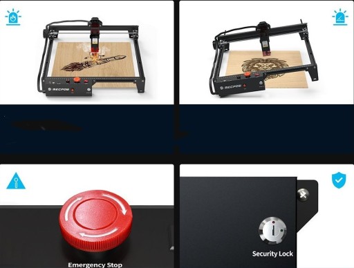 - Maszyna X3 wyposażona jest w czujnik płomienia i czujnik żyroskopowy, które mogą wywołać alarm i zatrzymać maszynę w przypadku wystąpienia pożaru lub przechylenia przekraczającego 50±5°. Dodatkowo w zestawie znajdują się wyłączniki krańcowe, które zapobiegają wypadkom i zmniejszają zużycie, zapobiegając przesunięciu się maszyny poza bezpieczne granice, wydłużając żywotność grawera laserowego. Dodatkowo w każdej chwili możesz wcisnąć przycisk zatrzymania awaryjnego, aby zatrzymać maszynę i zablokować ją przed niepotrzebnym użyciem, co jest szczególnie wygodne, jeśli w pobliżu są dzieci.