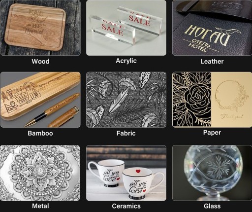 - Materiały do grawerowania laserowego: drewno, akryl, Chiny, tkanina, bambus, plastikowa płyta, skóra, owoce, chleb itp.