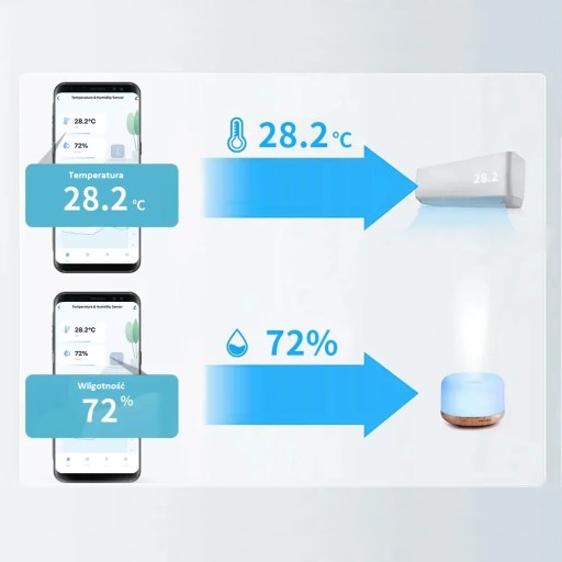 Przykład 2: Jeśli wilgotność powietrza w pomieszczeniu spadnie poniżej 72%, nawilżacz powietrza może się włączyć automatycznie.