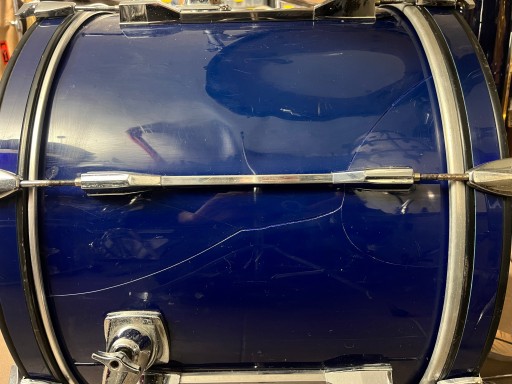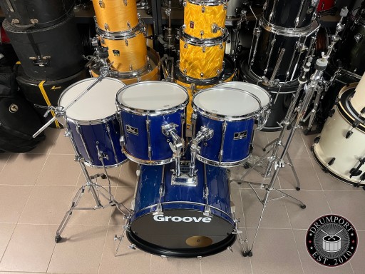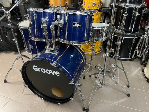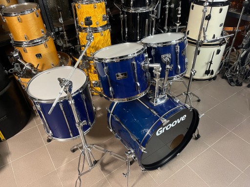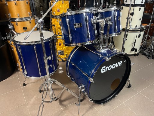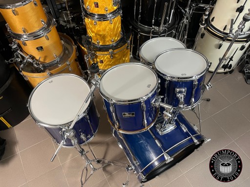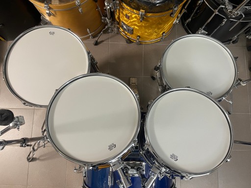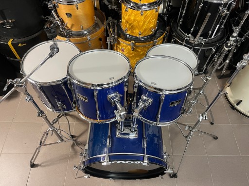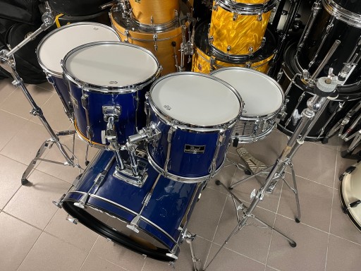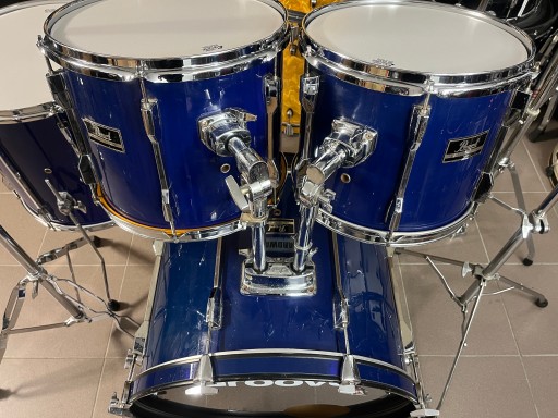 Rozmiary bębnów to 22", 12", 13", 16", 14" werbel stalowy. Zestaw jest w dobrym stanie i posiada ślady normalnego użytkowania. Na centrali z jednej strony pękła okleina i została podklejona i uzupełniona, widać to dokładnie na zdjęciach. Bębny sprzedawane są z kompletnym hardwarem. Naciągi uderzane na tomach i werblu są nowe.